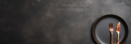 Table setting with a black plates on a black background. Minimalism concept. Top view, copy space, panorama