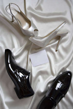 wedding accessories. Bride and grooms shoes, wedding ring watches, bridal bouquet. Top view.