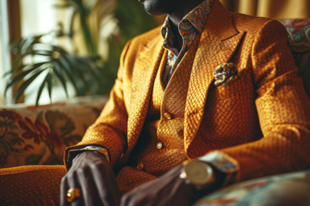 A close-up of a stylish man adjusting his elegant jewelry in a luxurious environment. His sophisticated suit with intricate patterns reflects a high-fashion vibe, highlighting confidence and charm.