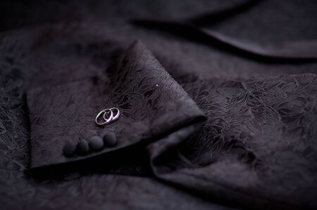 Wedding rings. Black leather shoes, watch, blue bow tie and cufflinks, on a white window sill.
