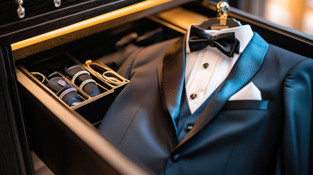 Neatly folded tuxedo with matching accessories in a travel case concept