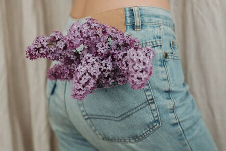 Blooming lilac flowers in back pocket. Woman posing with lilac flowers in denim jeans pocket on rustic background. Creative image. Sensual atmospheric mood. Hello spring