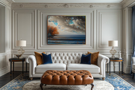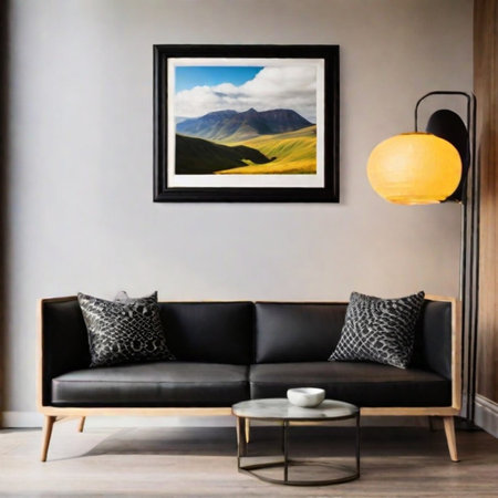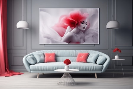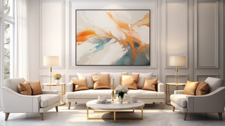 Concept illustration of a modern living room with a picture frame on the wall. Generative AI