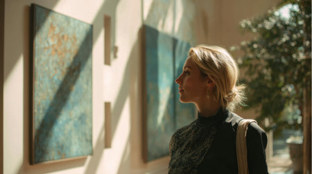 A thoughtful woman studies colorful abstract paintings in a bright art gallery surrounded by warm light.