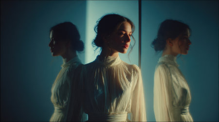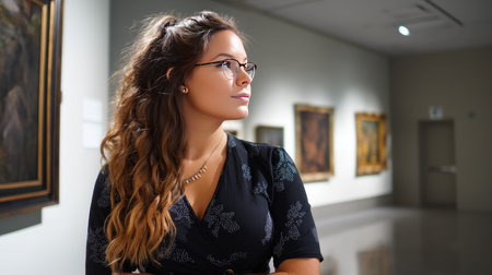 A woman art gallery painting museum reflection standing alone elegant thoughtful