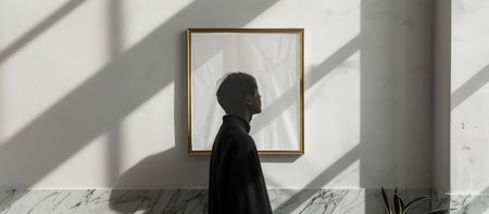 An elegant gold frame mockup displaying a black-and-white portrait photograph, placed on a marble surface with soft natural lighting for a luxurious feel, --ar 16:7 --v 6 Job ID: 6c9cba09-e99f-415f-83fe-61aab7c29ced