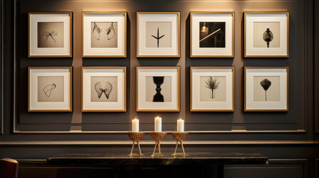 Framed visuals of diverse subjects are arranged on a sleek wall, creating a captivating gallery that combines modern design with artistic expression.