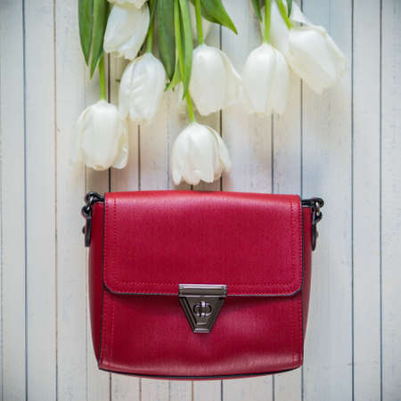 Fashion synthetic leather handbag on a wooden background.