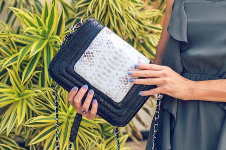Closeup woman hands with fashion luxury snakeskin python handbag. Outdoors.
