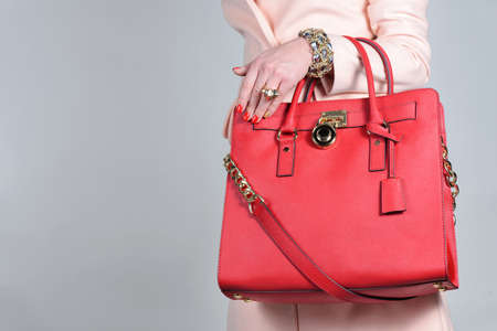 Woman holding red leather bag. Fashion