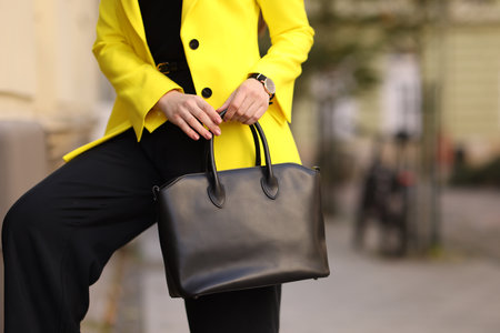 Businesswoman in stylish suit with bag outdoors, closeup. Space for text
