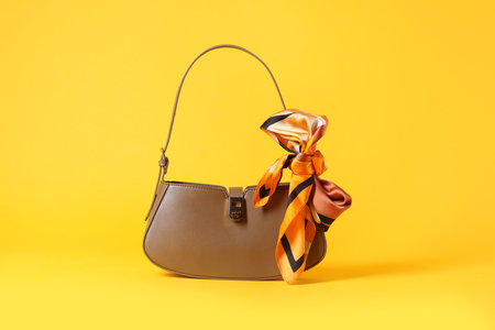 Stylish brown leather bag with handkerchief on yellow background