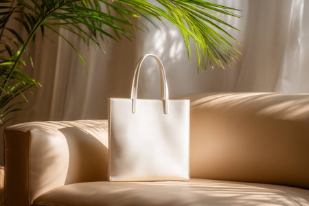 A sophisticated white tote with tactile surface details rests on a warm beige sofa, surrounded by lush greenery and bathed in gentle sunlight, creating a serene, sty