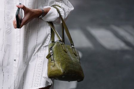 Milan, Italy - June, 19, 2023: close up of hand holding olive green textured handbag against white embroidered shirt