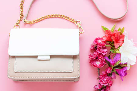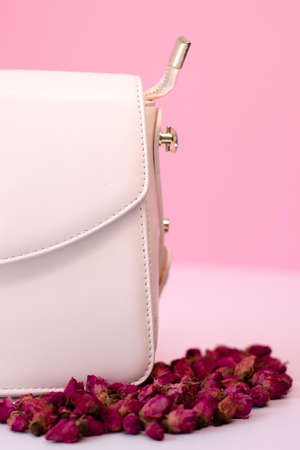 fashion photo of purse. white woman handbag near little roses flowers. isolated on white and pink background. product composition photography.