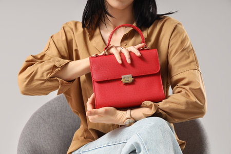 Beautiful young woman with stylish red bag sitting on armchair against gray background, closeup