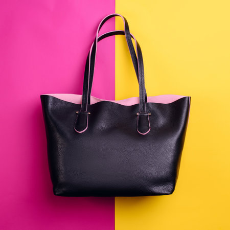 Trendy black leather female bag with contrasting pink trim isolated on a vibrant pink-yellow background. Discount promotion poster for an e-commerce store. Fashion style and trend. Modern design.