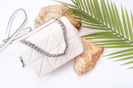 Fashionable female bag with iron chain and green plant on white background.
