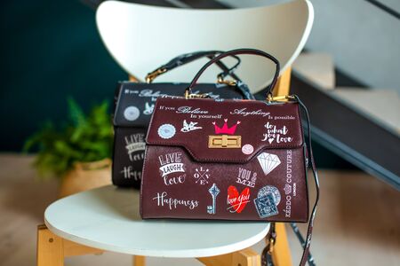 Stylish female bags on table