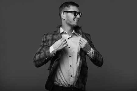 Fashion young handsome man with fashionable sunglasses on gray background