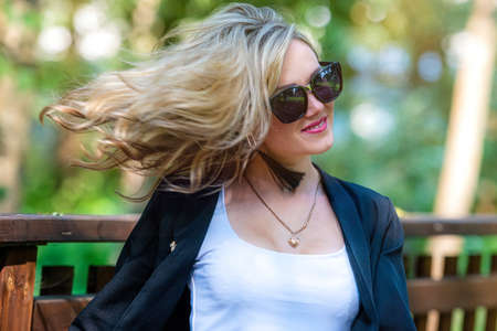 fashion portrait of a stylish nice blonde woman in sunglasses on a defocused park background