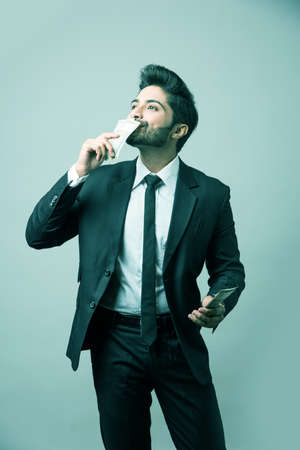 Happy bearded Indian businessman holding fan in hand, Indian Rupee currency bills of 500 , standing isolated over white background