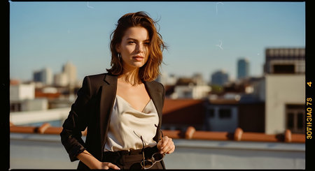 Stylish young woman posing outdoors in summer street. Fashion portrait of beautiful female model in trendy suit