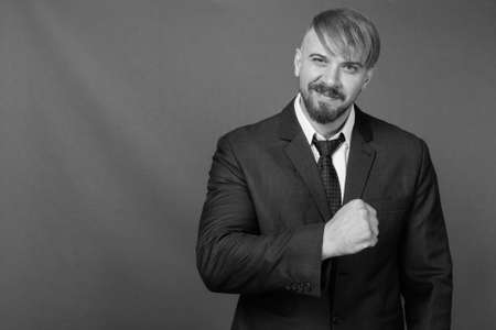 Bearded businessman with blond hair against gray background