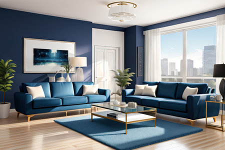 Modern luxury living room interior design with blue sofa 3d Illustration