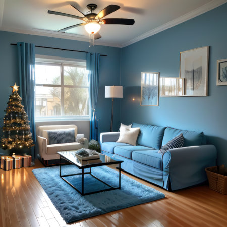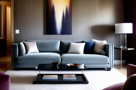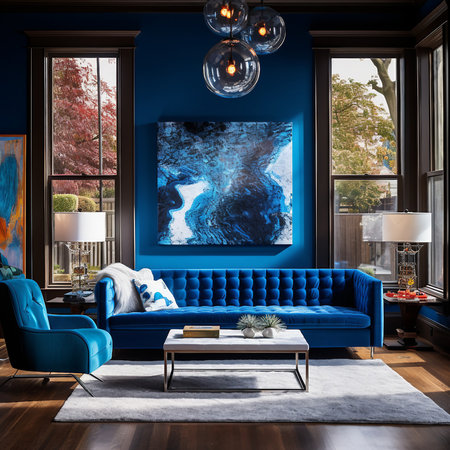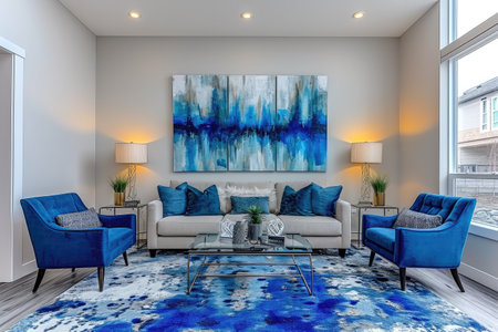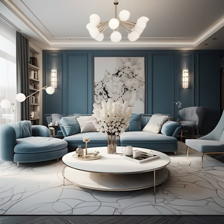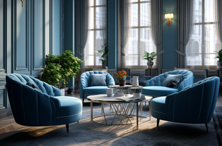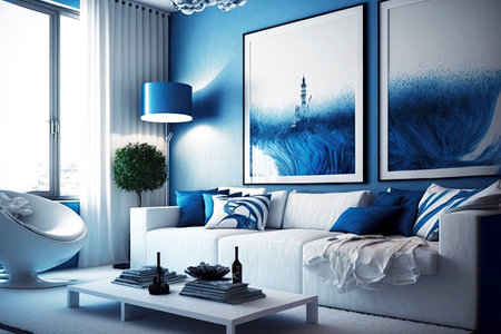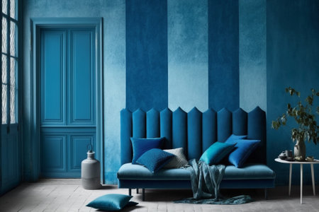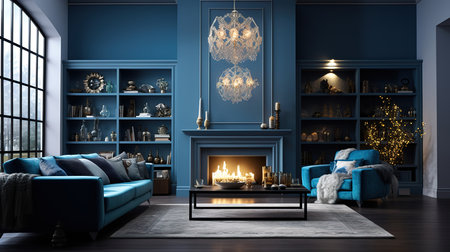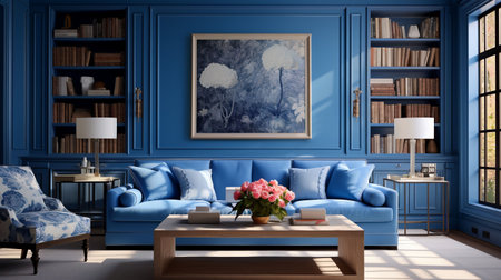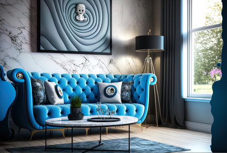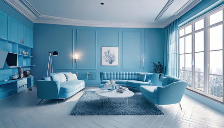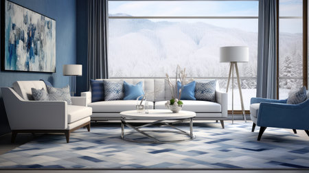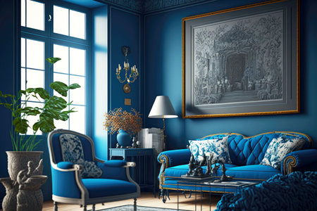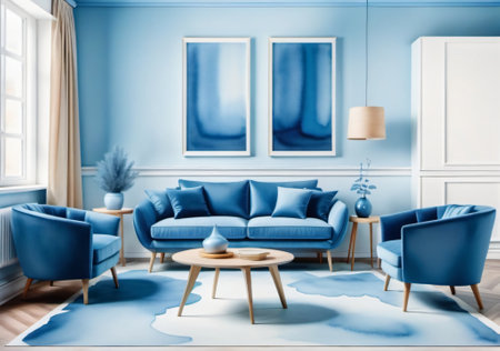 An AI generated illustration of a modern living room interior in blue colors