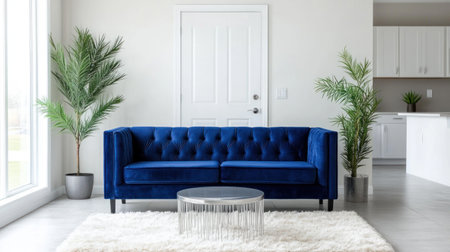 Wide shot of a living room with white walls that have a bright and airy feel, featuring a modern interior design. The room includes a blue velvet couch, a large fluffy rug, a silver coffee table, and a tall indoor plant in the corner. An open door in the background leads to the kitchen, and the space is filled with natural lighting from the windows. The scene is captured using a Nikon D850 camera with an f/2 lens, highlighting the spacious layout and clean lines of the contemporary decor --chaos 30 --ar 16:9 --v 6.1 Job ID: 906d18ec-503a-454f-946d-9ef233ef5390