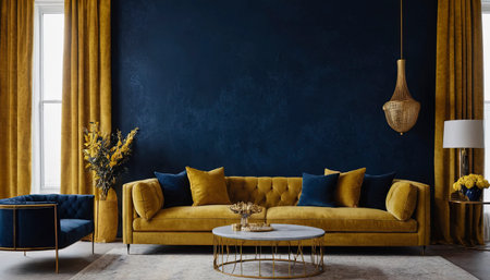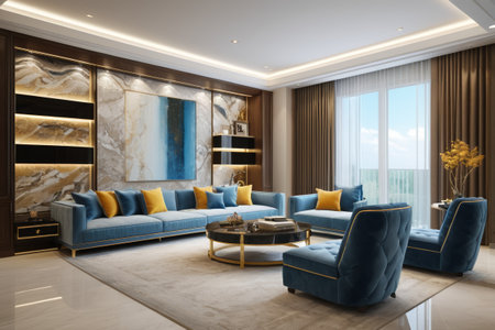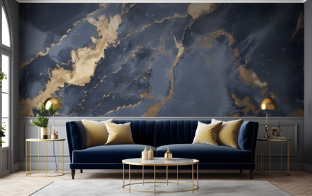 Interior of modern living room with blue sofa, gold coffee table and marble wall. 3d illustration, Generative AI