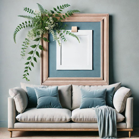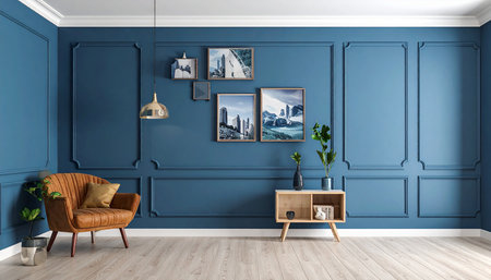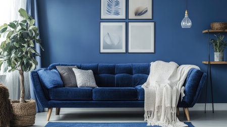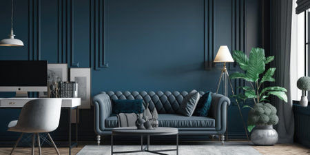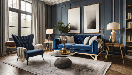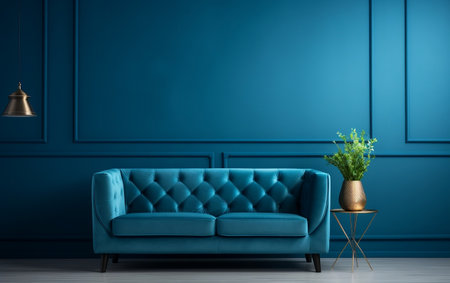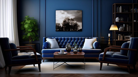 Blue sofa in classic interior with picture frame on the wall. AI generated