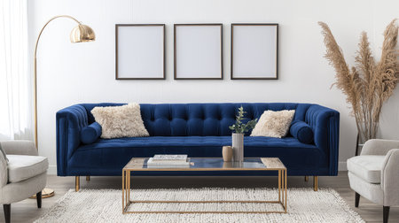 Well-decorated modern living room showcasing a plush navy blue sofa, accented with gold elements. The room features a simple rug, neutral-toned chairs, a coffee table and decorative items. Empty picture frames are on the walls. Dried plants add a touch of nature.