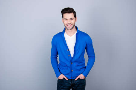 Photo of smiling, cheerful young female in grey dress on blue background. Emotional portrait