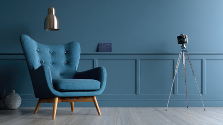 A stylish blue armchair sits in a room, accompanied by a camera on a tripod. The scene showcases a blue color palette, with a wall featuring paneling. Overhead lighting and a minimal composition suggest a modern, indoor environment, potentially suitable for commercial or lifestyle content.