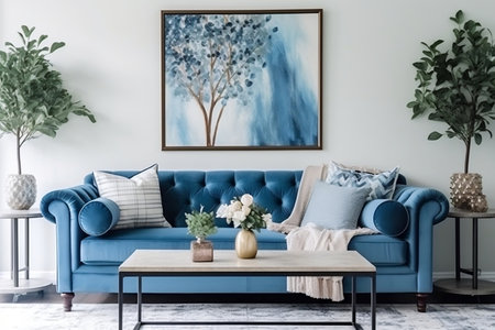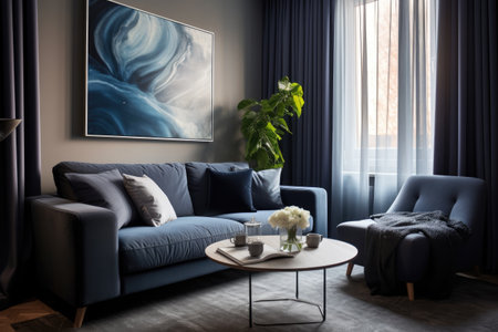 Interior of modern living room with blue sofa, coffee table and painting on wall