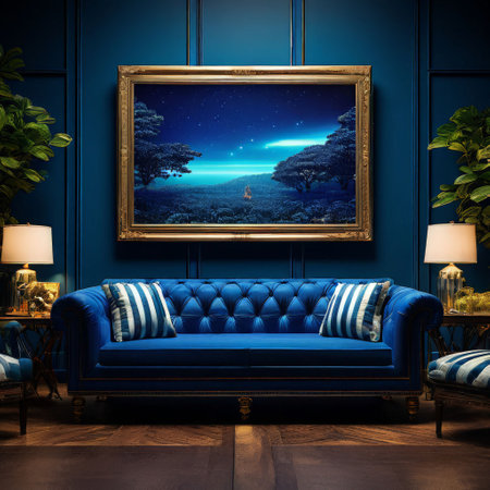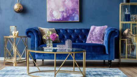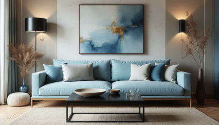 Discover an elegant living room featuring a plush blue sofa, artistic wall decor, and stylish accents. The space combines comfort and modern design for a cozy atmosphere.