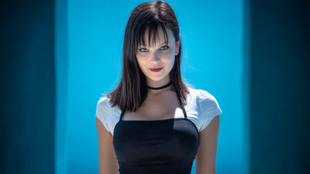 A young woman stands with a playful smile, wearing a stylish outfit, against a bright blue backdrop. The scene captures her playful spirit and confidence during daylight.