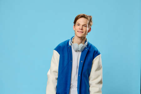 cute, handsome guy in a bomber jacket listens to music in big headphones holding them with his hands. Studio photography on a blue background with space for an advertising mockup