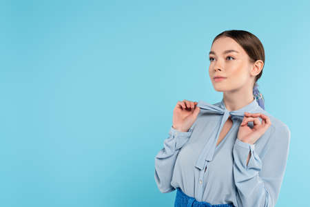 trendy woman looking away while touching bow on blouse isolated on blue