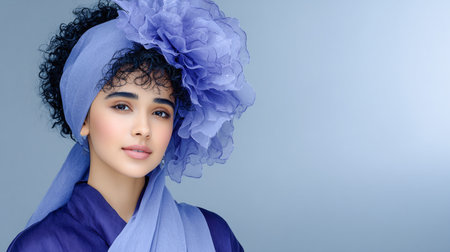 Female model with curly hair, wearing a blue headscarf and floral decoration, poses gracefully against a soft gradient backdrop, highlighting modern fashion and beauty