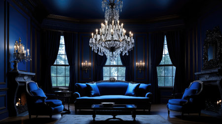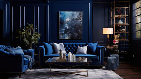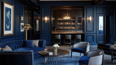 This image showcases a sophisticated living room with a deep blue color scheme, featuring elegant furniture, tasteful decor, and a stylish bar area, ideal for relaxation.
