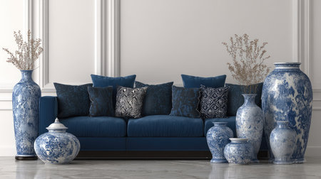 A modern living room featuring a stylish blue couch adorned with decorative pillows, complemented by elegant blue and white vases for a serene ambiance.