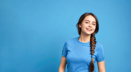 young woman with braids in light blue T-shirt smiles, there is emotion on her face, looking into camera. copy space around her for advertising or text placement