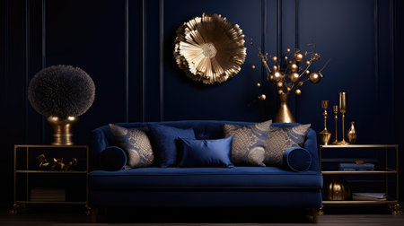 Blue Sofa and Empty Dark Blue Wall Background Interior Generative AI