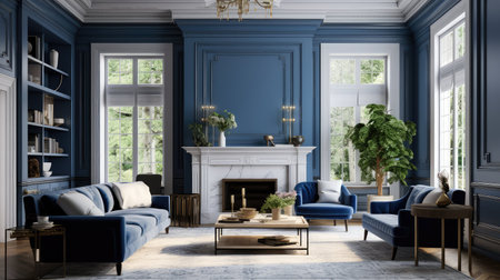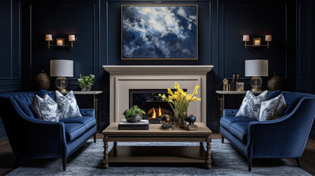 This sophisticated living room embodies modern elegance with its deep blue walls and stylish furniture. A cozy fireplace creates a warm atmosphere, complemented by contemporary decor elements and abundant natural light streaming through large windows.