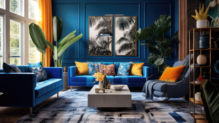 eclectic blue living room and carpet illustration vibrant focal, patterns textures, bold stylish eclectic blue living room and carpet