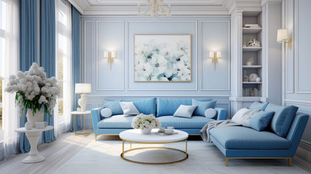 Delicate light living room design with home interior blue