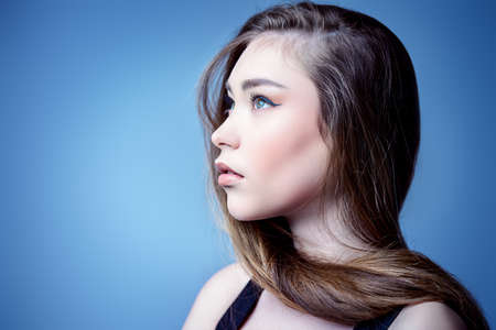 Portrait of a happy smiling young Asian woman in a blue blouse on a blue background.